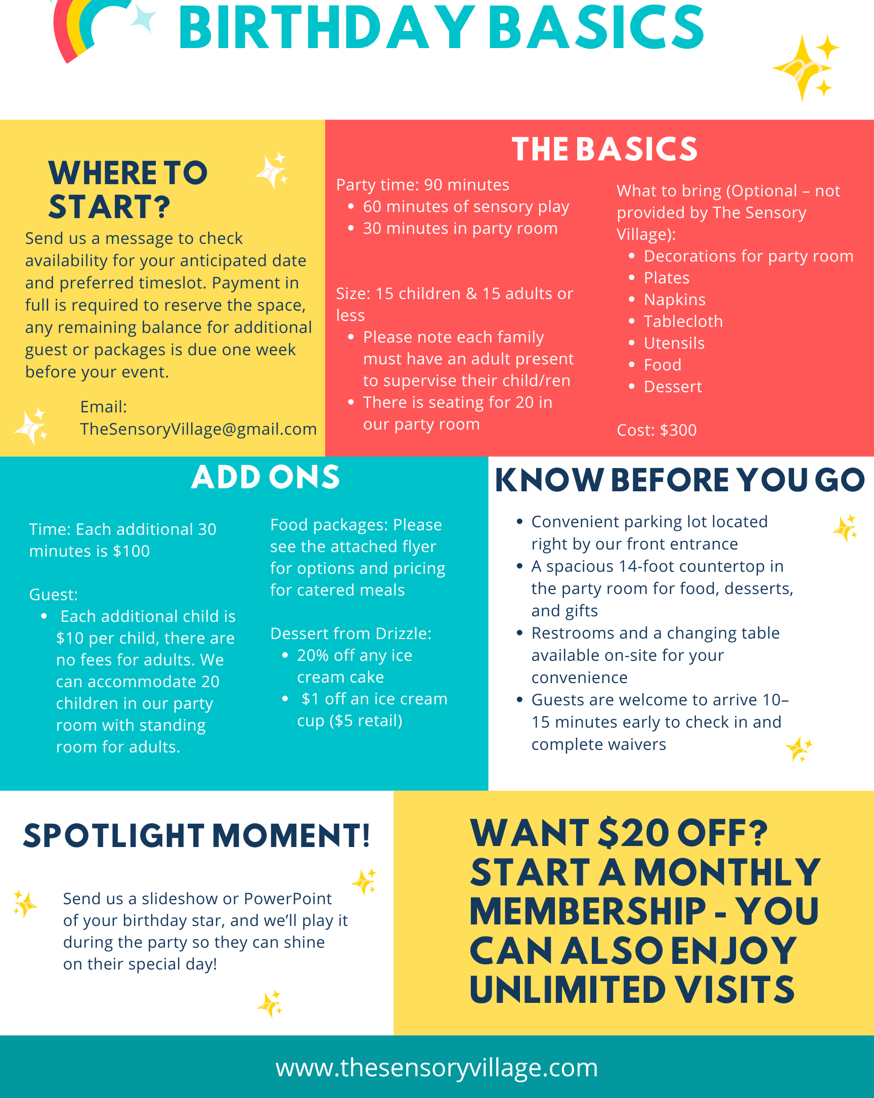 Celebrate with us! Our special events include 90 minutes of fun for just $300. Enjoy 60 minutes of play in our sensory houses, water room, indoor gym, and STEM wall, followed by 30 minutes in a private birthday room.